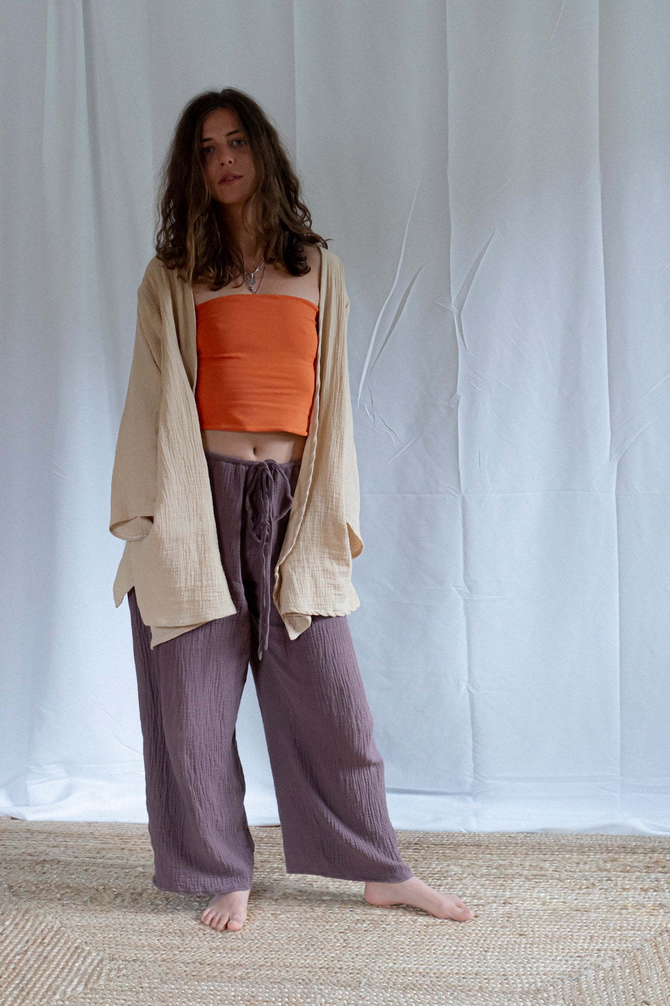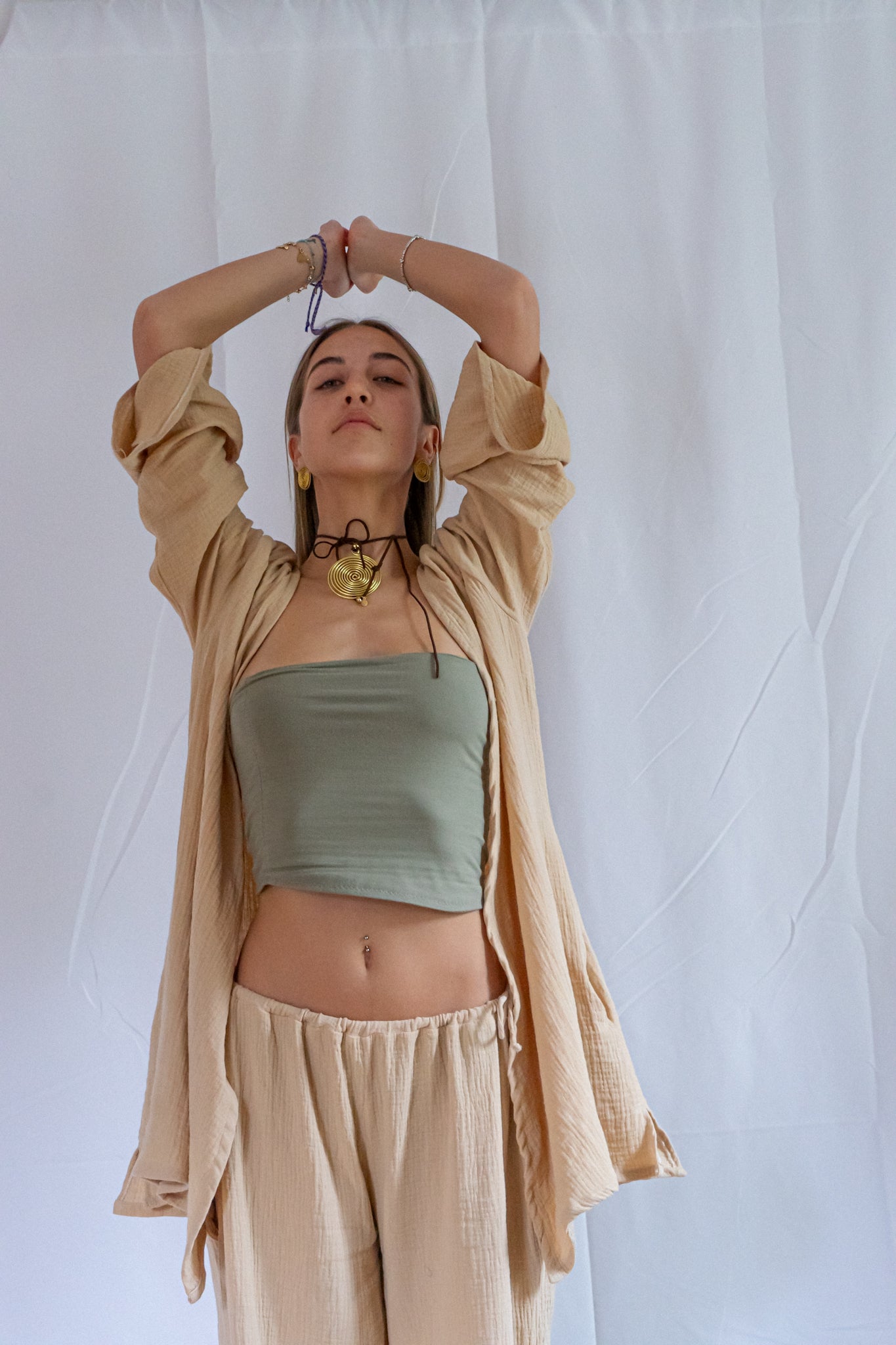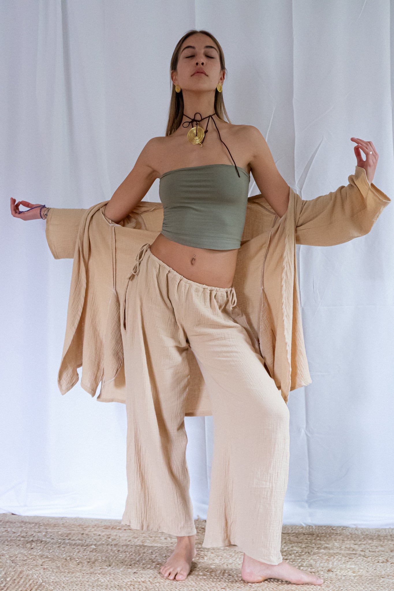Lascia che il Kimono Dress avvolga i tuoi gesti e il tuo respiro. Morbido, fluido e naturale, segue le linee del corpo adattandosi a ogni momento: dalla quiete delle mattine fresche alla dolcezza dei pomeriggi assolati. Puoi indossarlo aperto come coprispalle o avvolgerlo in un abbraccio leggero per trasformarlo in un vestito.