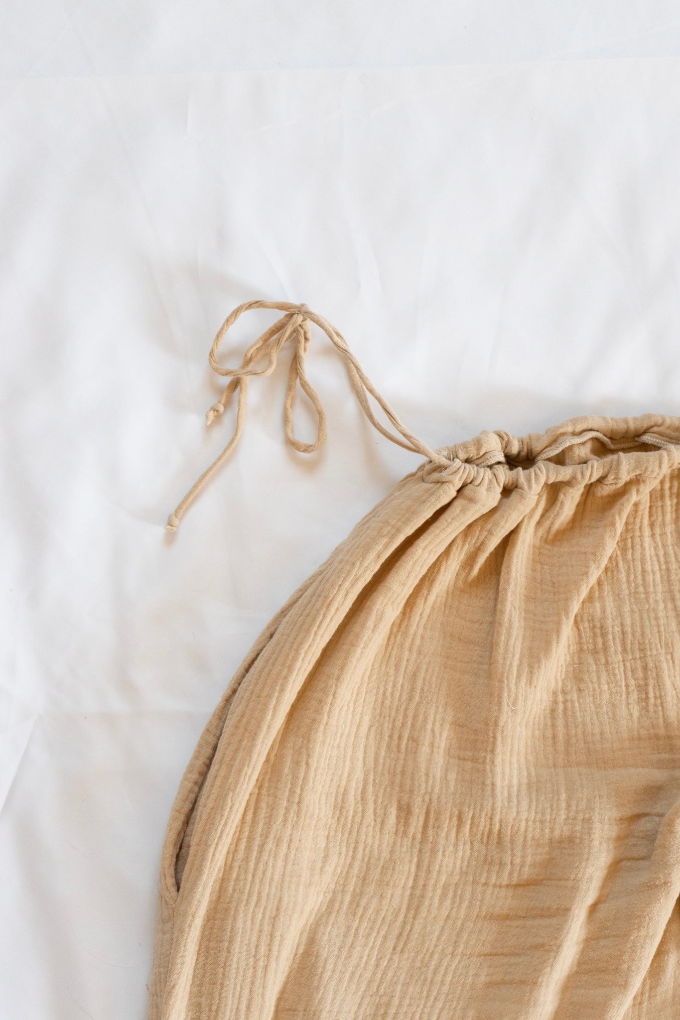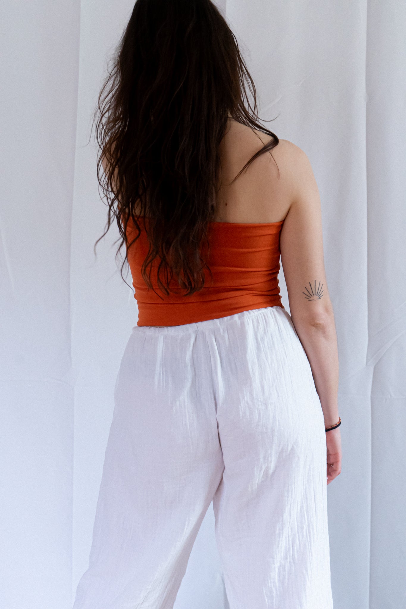 Cammina leggera con il Pantalone Aria. Disponibile in due versioni : Dritto e Curvy (per referenza visiva il Dritto lo trovi in Latte e in Oliva e il Curvy lo vedi in Sabbia e in Terra, ma sono realizzati in tutti e 4 i colori). Morbido cotone naturale che segue dolcemente ogni tuo movimento, accarezzando le tue curve e adattandosi con eleganza alle forme del tuo corpo. Perfetto per ogni momento di benessere, dalla meditazione ai momenti di relax, fino alle attività quotidiane. La vita elastica e il tessuto leggero rendono ogni passo libero, comodo e naturalmente femminile.